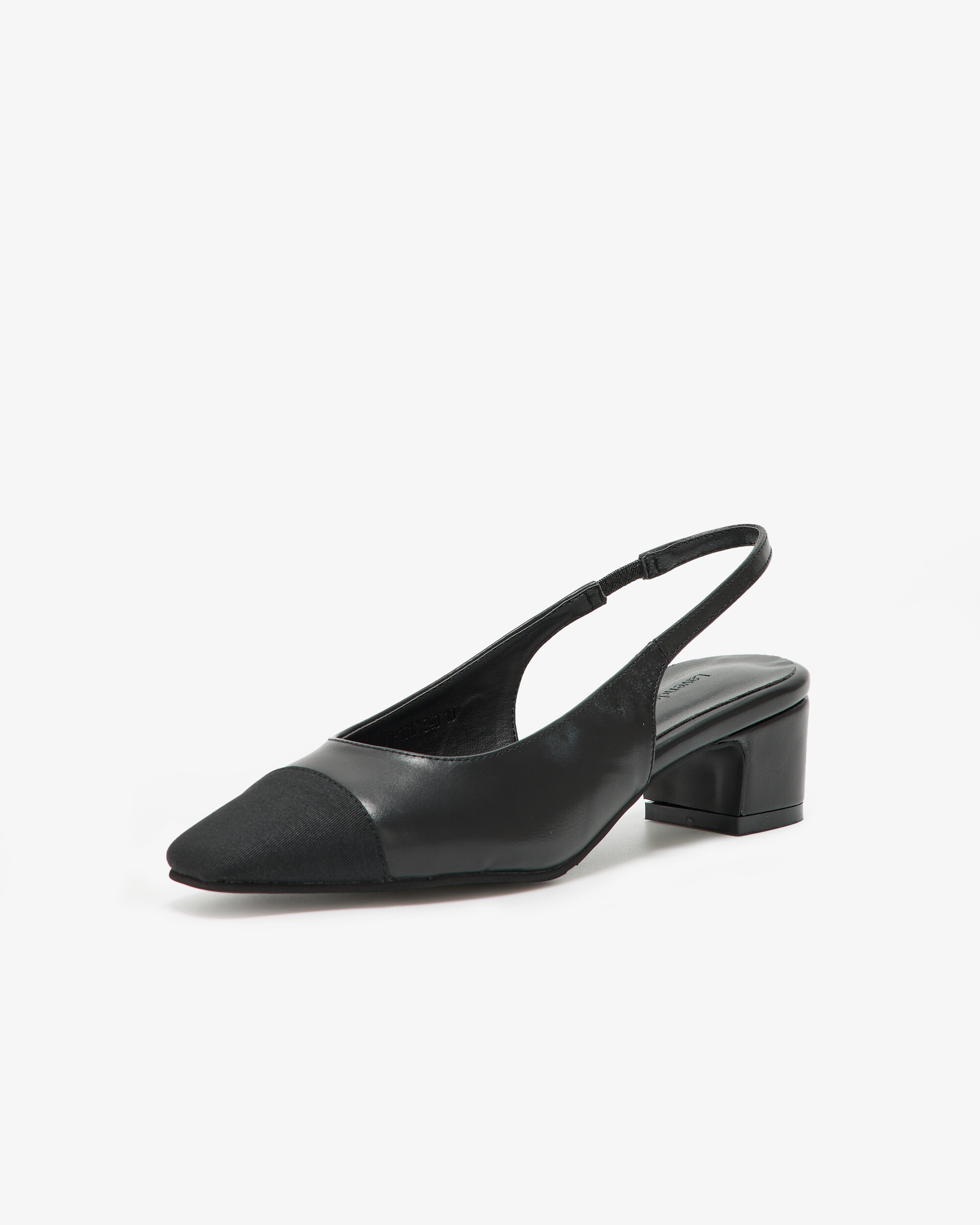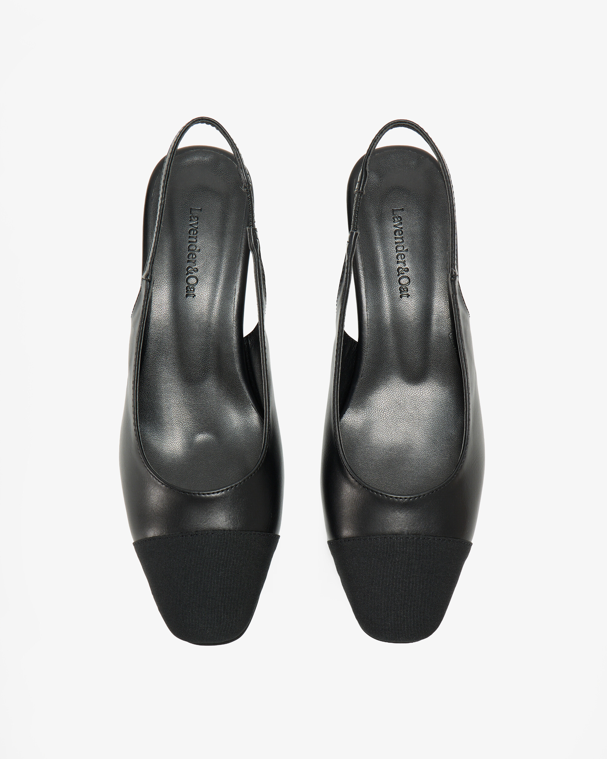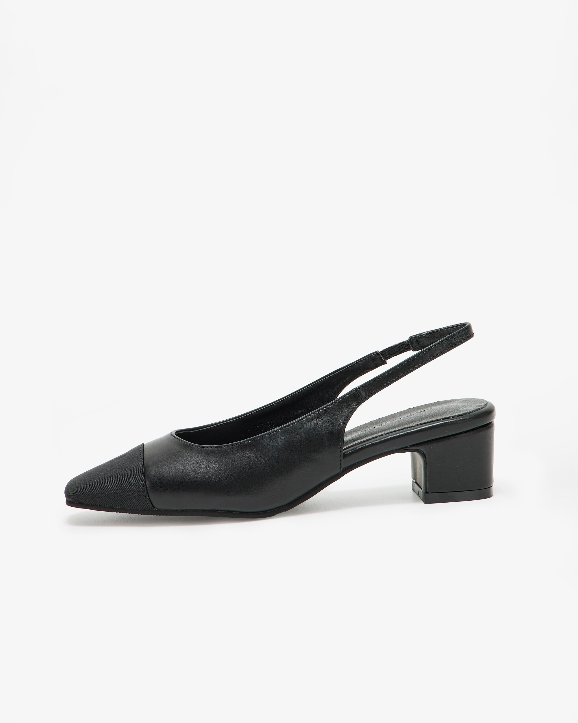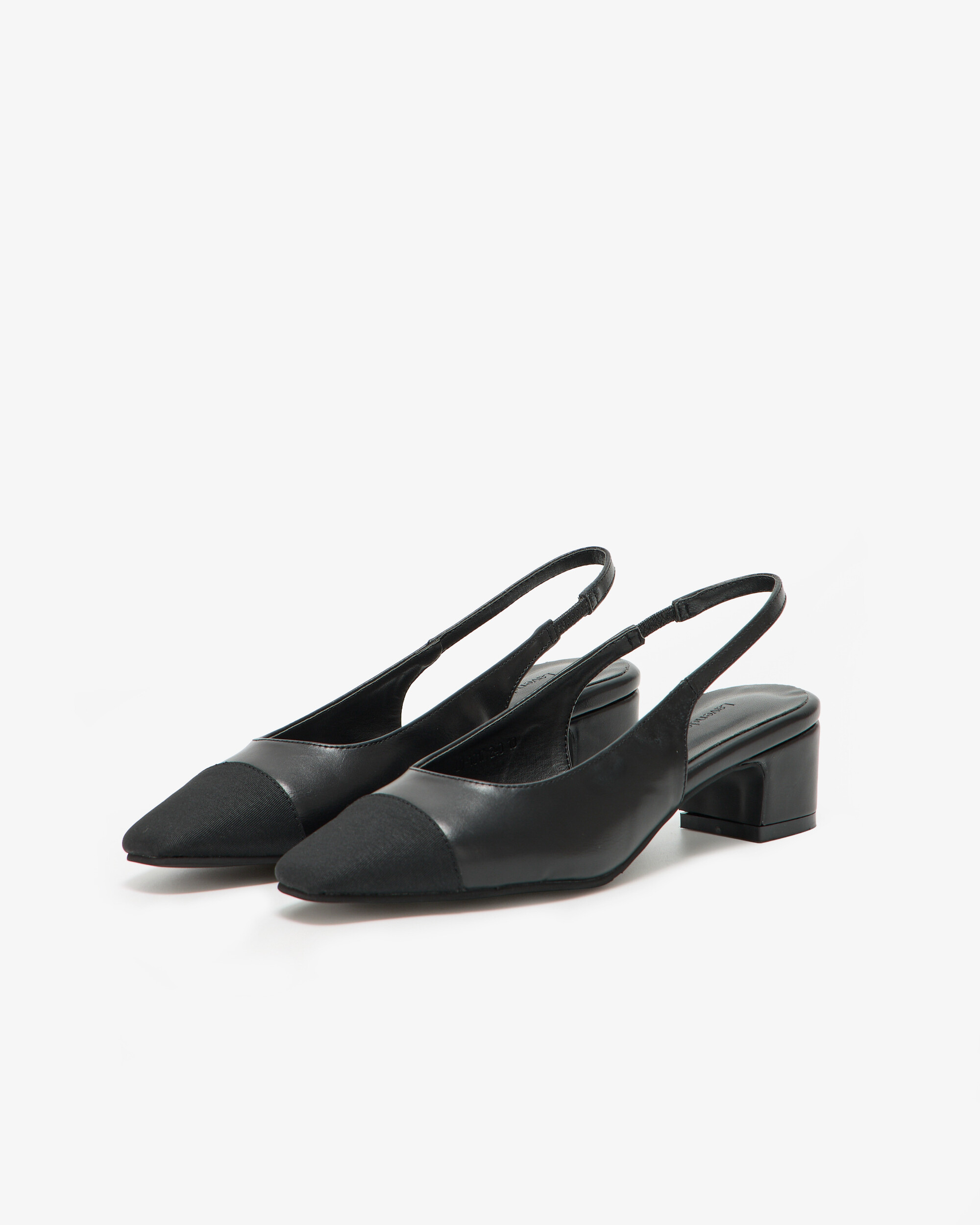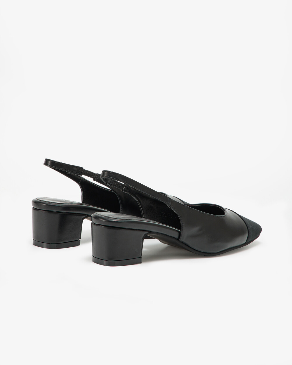 세련된 투톤 디자인과 안정적인 5cm 굽이 돋보이는 투톤 슬링백입니다.
